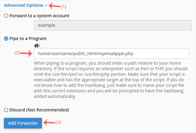 3. In the Destination field, click on Advanced Options, select Pipe to a Program and enter the full path of your pipe script, such as home/username/public_html/myemailpipe.php. You may have noticed that we do not use a slash at the beginning of the URL.