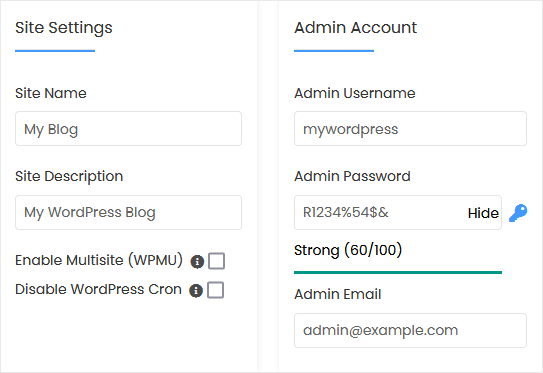 • Admin Username: Your new WordPress username (for security reasons, do not use the administrator or the admin username).