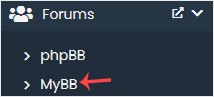 4. On the left side, locate the Forums category. Click on it and then on the MyBB link that appears.